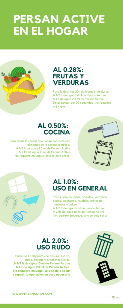 Para todos los usos en el hogar desde la desinfección de frutas y verduras hasta el tratamiento de coladeras o contenedores de basura, Persan Active es el aliado ideal.